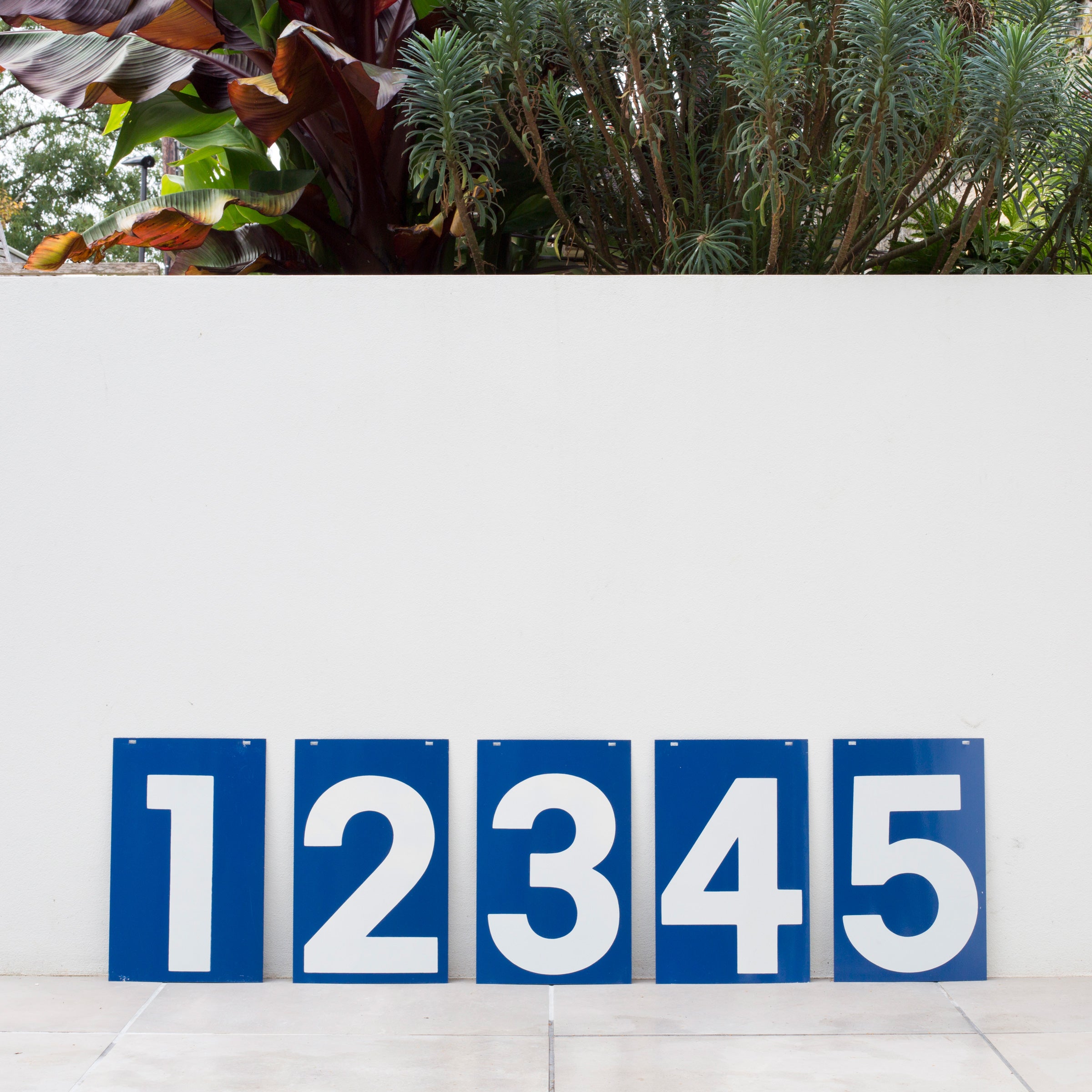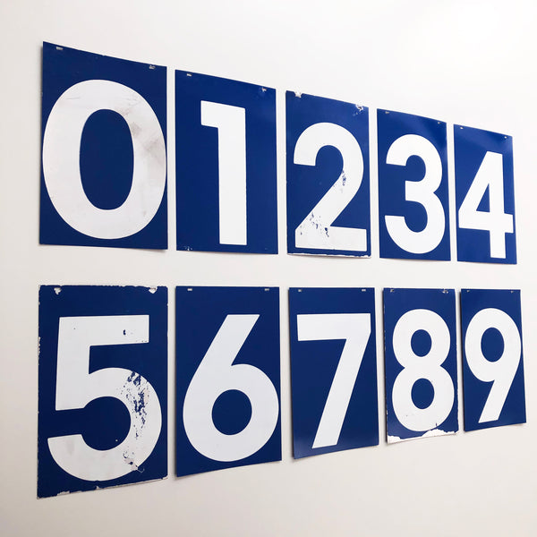 Vintage metal blue and white reclaimed gas station number sign from Vermont USA