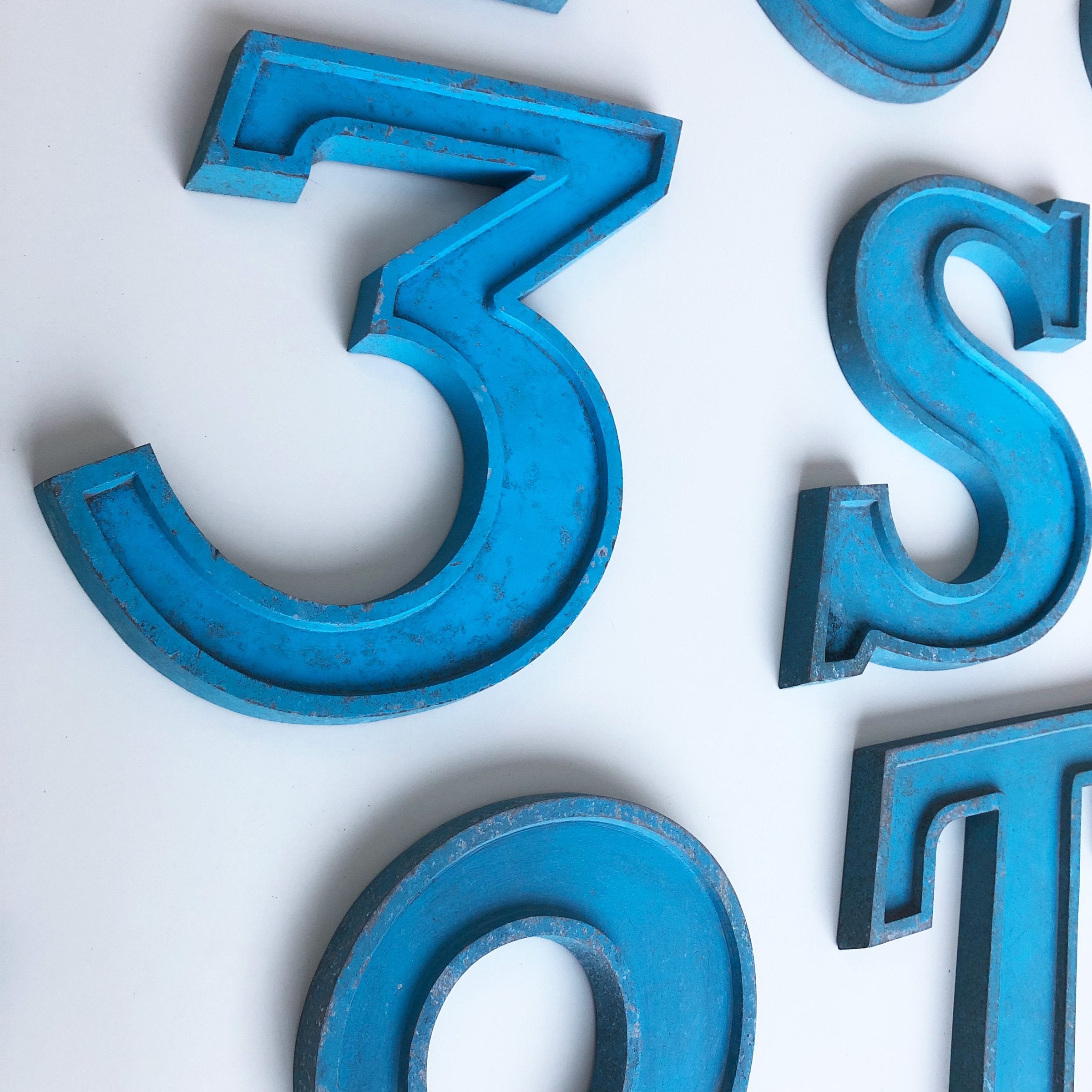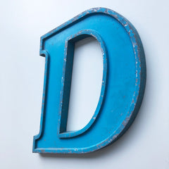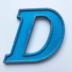 Cast metal blue letters. Reclaimed from an old letter factory, these are vintage and unique.