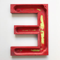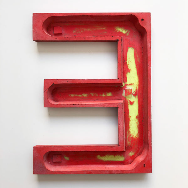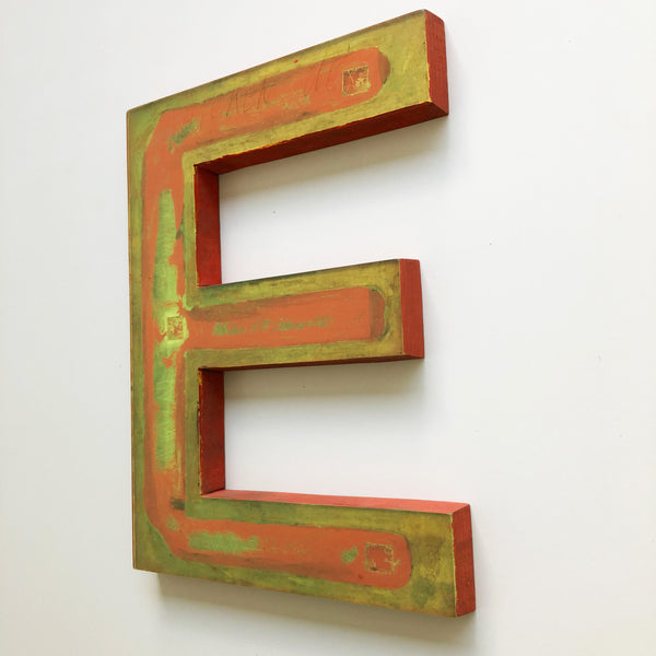 This letter E is 12 1/2 inches x 9 1/4 inches x 1 inch (approx).