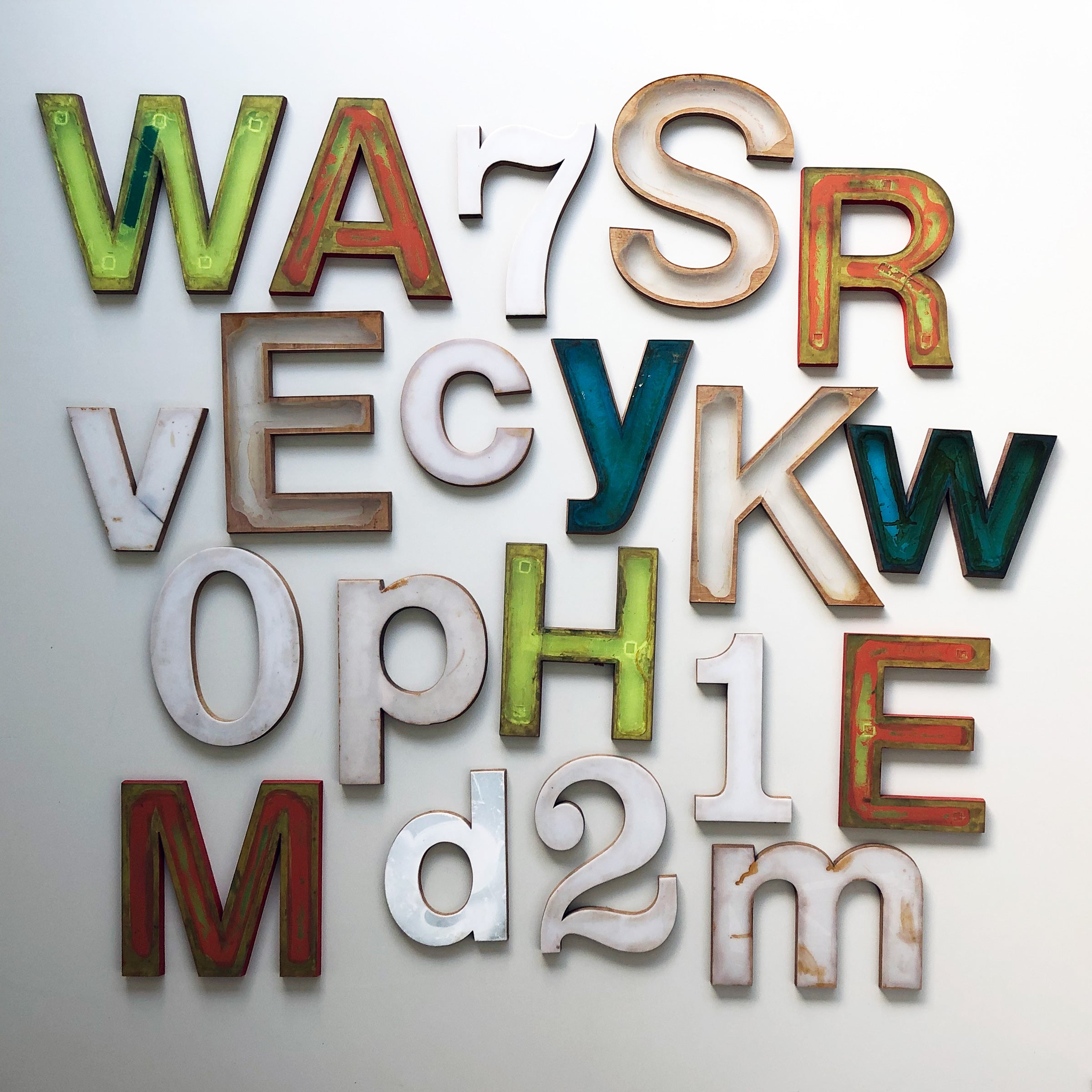 This collection are probably prototypes, with perspex and plywood edges, many have cracks, repairs and are covered in paint - a lovely piece of typography history, definitely showing their beautiful age!