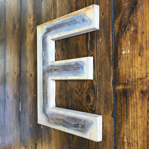 This letter E is 14 inches x 10 1/2 inches x 1 inch (approx).