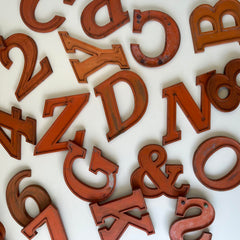 This collection are probably prototypes/samples so all unique! Exquisitely crafted wooden letters (some with perspex on the back), some have cracks and repairs and all are covered in stain/paint and are charmingly distressed - a lovely piece of typography history, definitely showing their beautiful age!