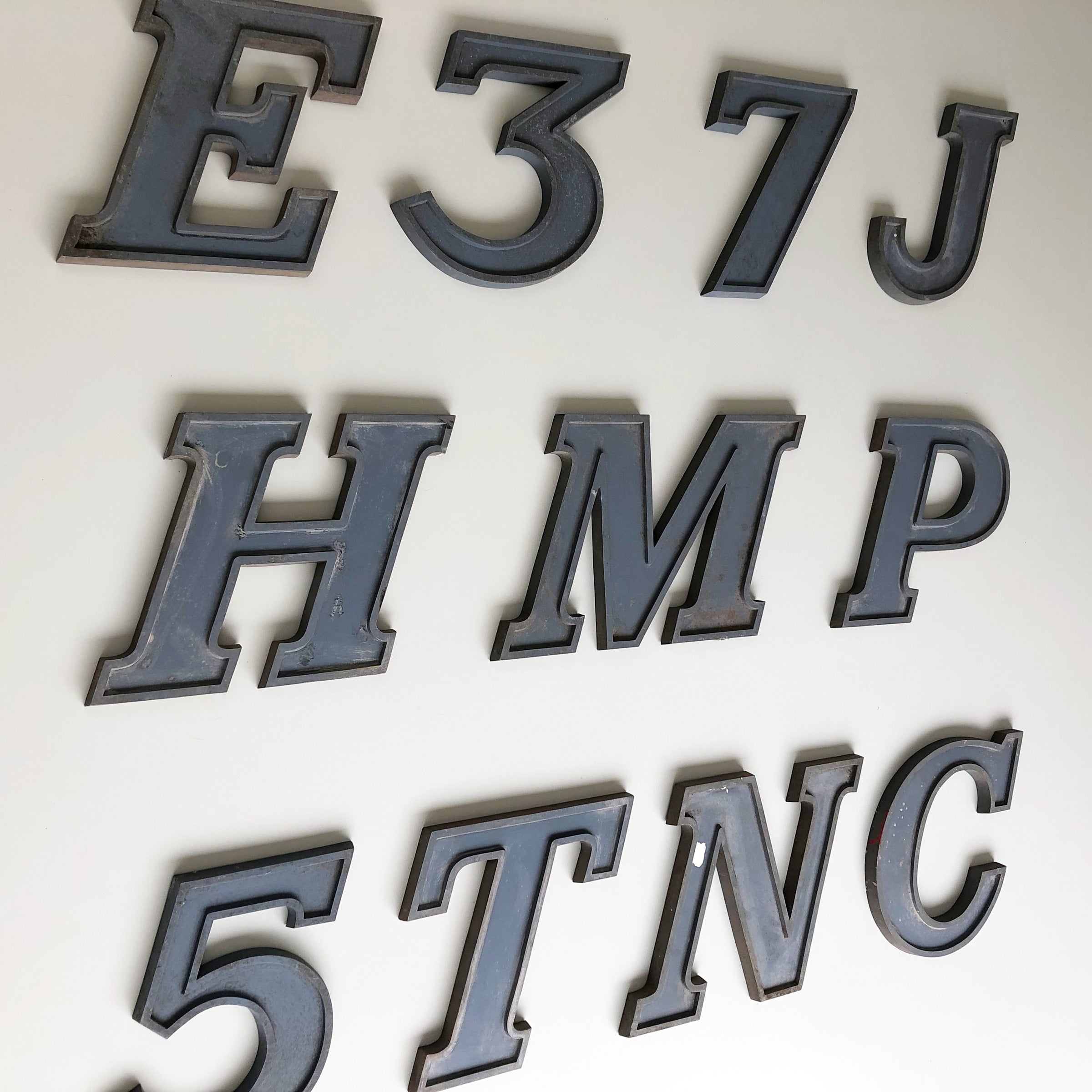 Cast metal distressed letters iEgyptian font italic. Reclaimed from an old letter factory, these are big, heavy and chunky with a fantastic aged patina!