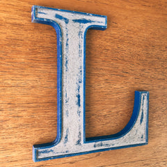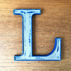 Cast metal blue distressed letters iclarendon font. Reclaimed from an old letter factory, these are vintage and unique with wonderful patina!