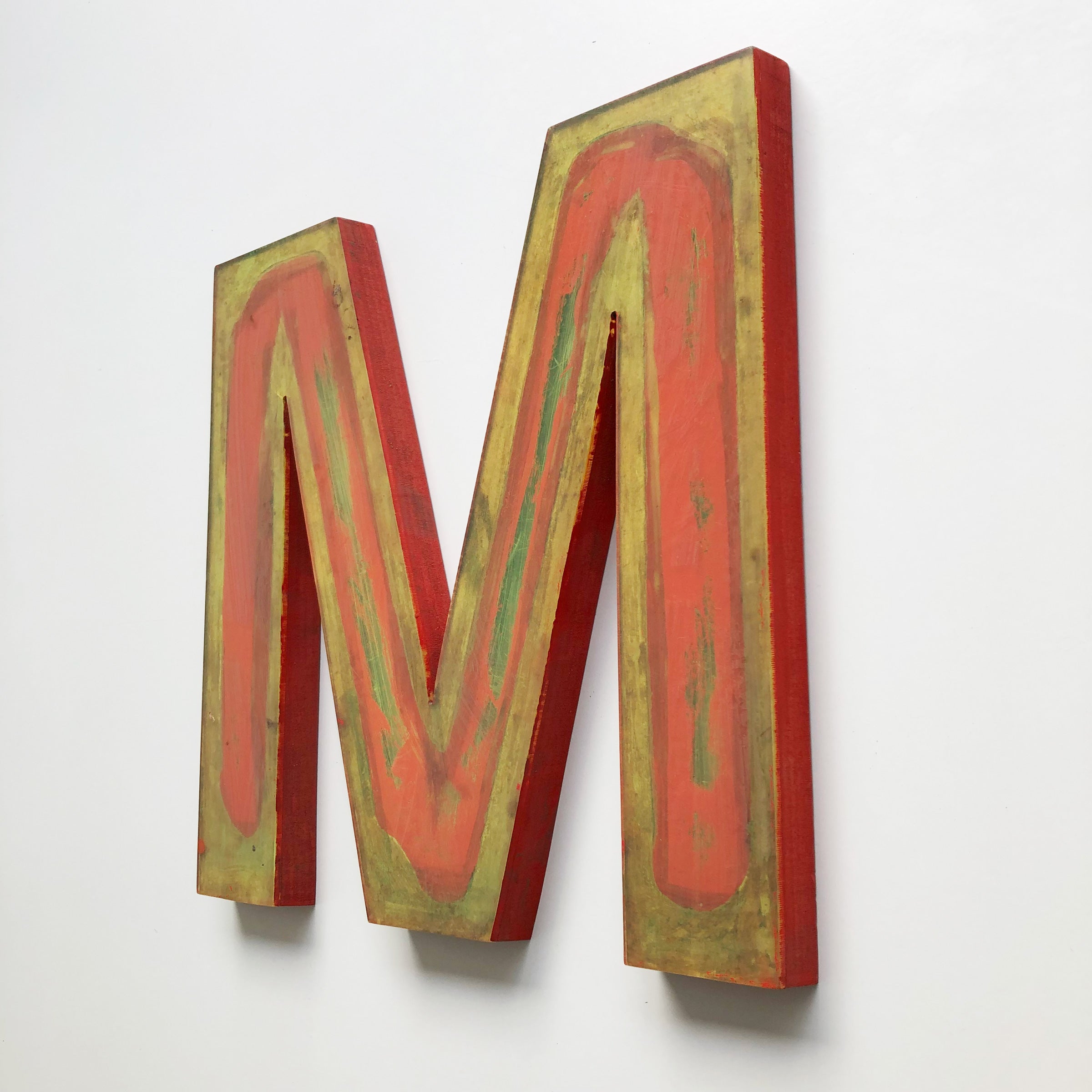 This letter M is 12 1/2 inches x 12 1/2 inches x 1 inch (approx).