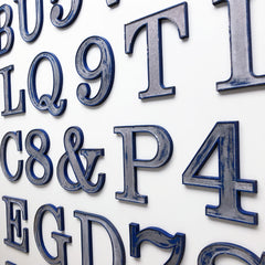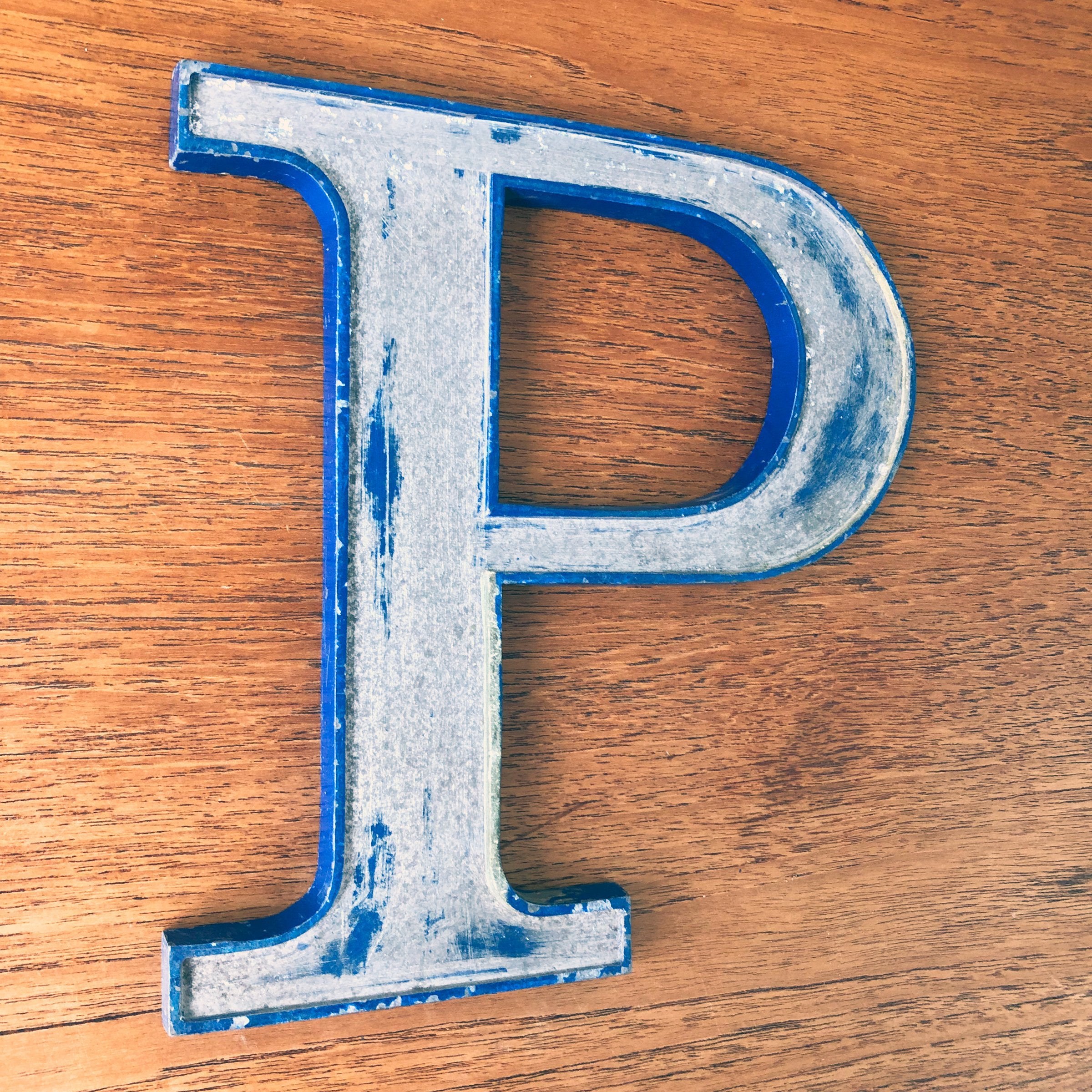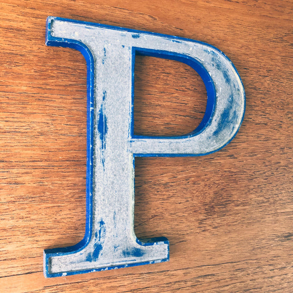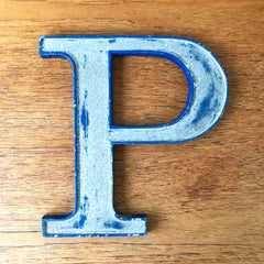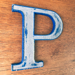Cast metal blue distressed letters iclarendon font. Reclaimed from an old letter factory, these are vintage and unique with wonderful patina!