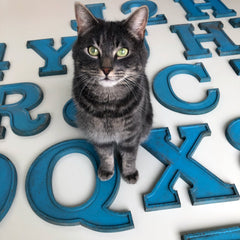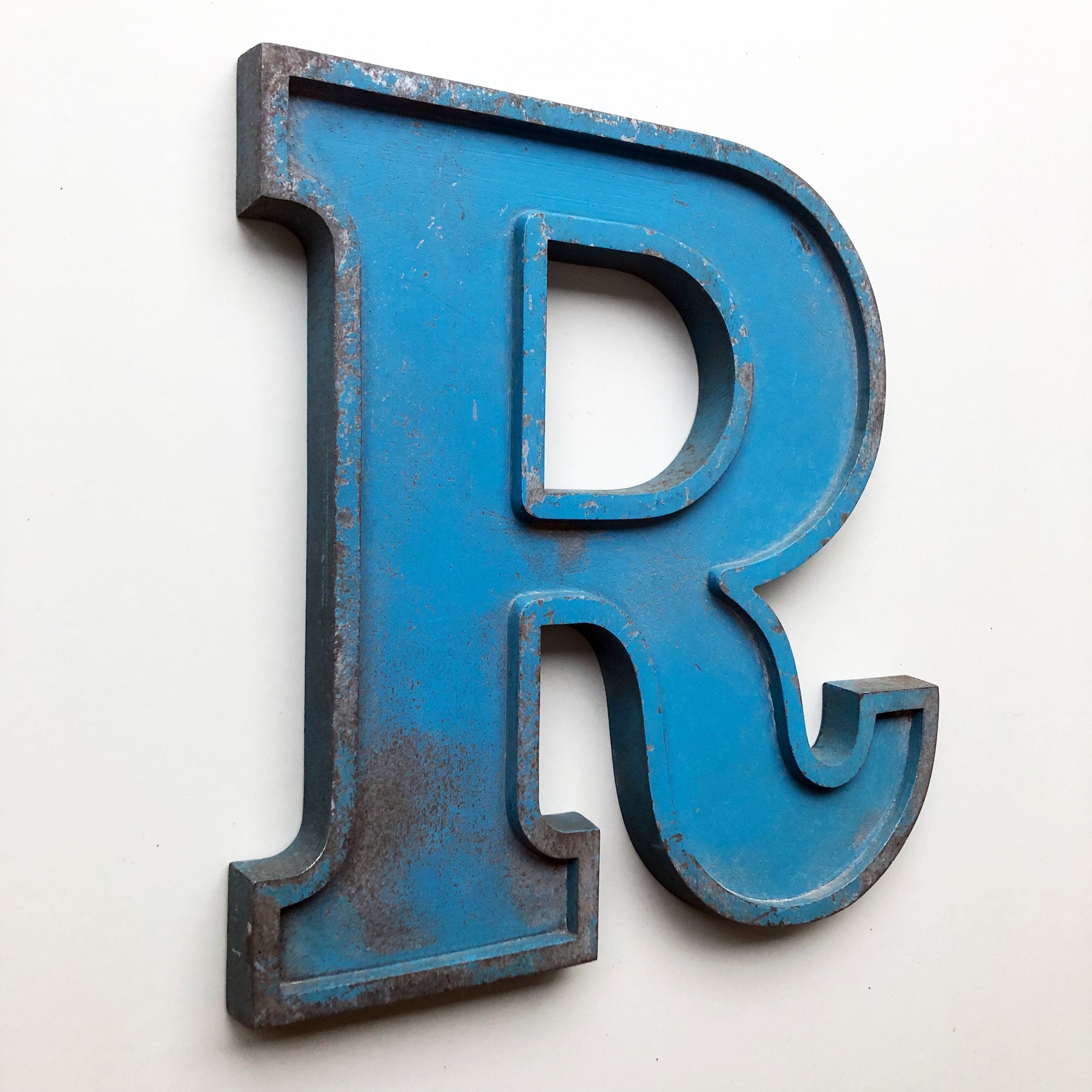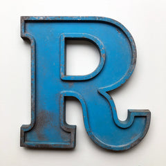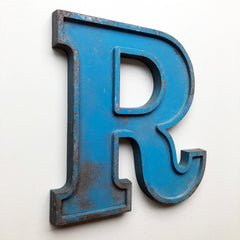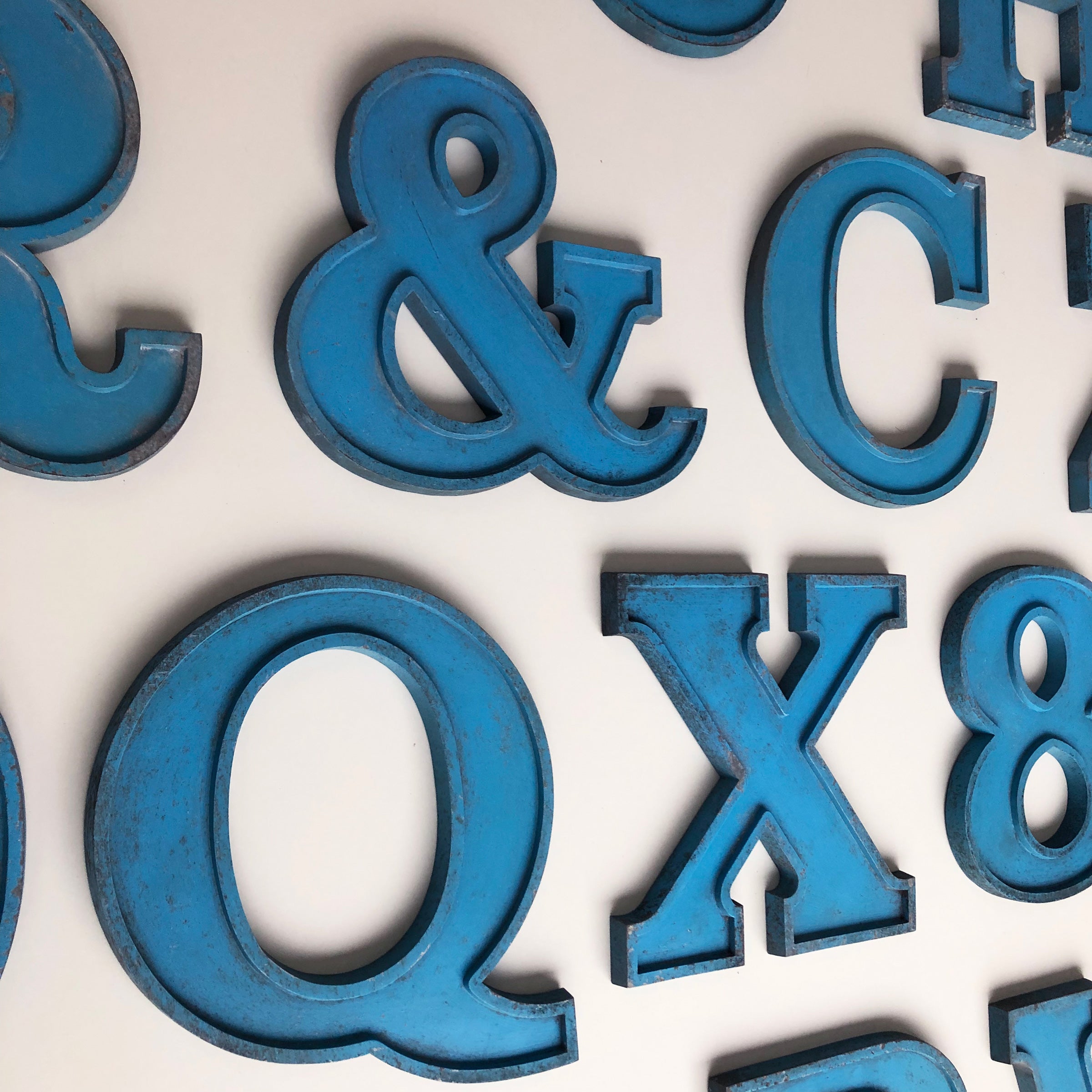 Cast metal blue letters. Reclaimed from an old letter factory, these are vintage and unique.
