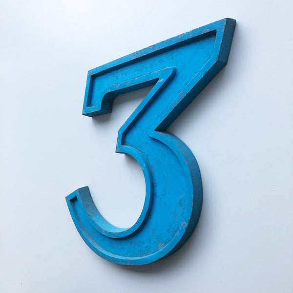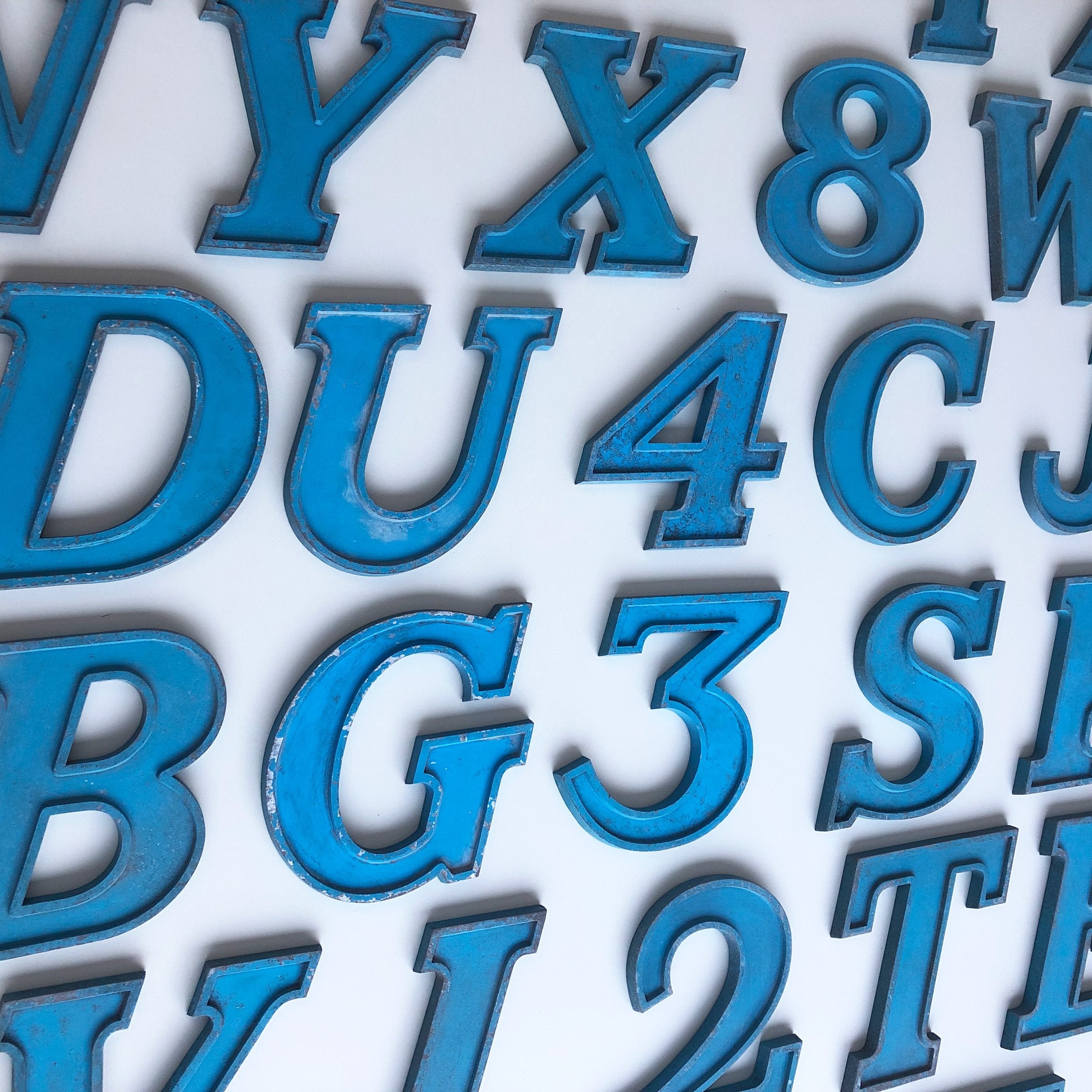 Cast metal blue letters. Reclaimed from an old letter factory, these are vintage and unique.