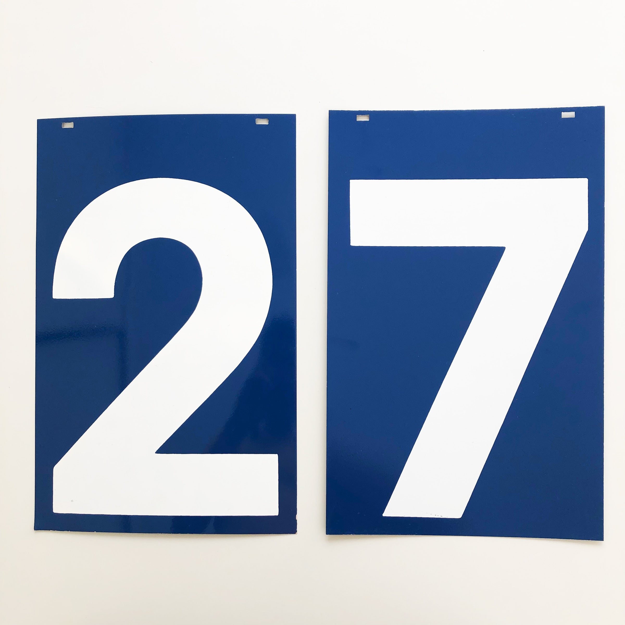 Vintage metal blue and white reclaimed gas station number sign from Vermont USA
