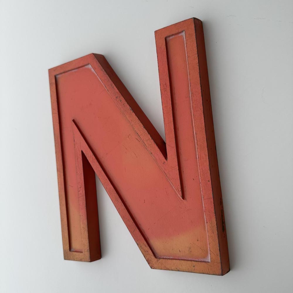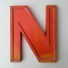 Heavy and chunky metal orange letters. Salvaged from an old disused letter factory, these are vintage, unique and wonderfully well used!